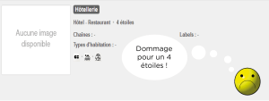 Toutes les conditions sont donc réunies pour faciliter la réalisation de supports de communication attractifs et efficaces. Choisissez le bon prestataire et « ya plus qu’à » ! Intégrations, saisies, un très lourd chantier a souvent été engagé pour disposer de toute l’offre touristique dans la base. (Au passage, bravo aux équipes qui assurent ce travail titanesque). Mais c’est là que ça se corse ! Il ne suffit pas que les fiches soient créées et validées pour être pertinentes, encore faut-il que les champs indispensables ne soient pas vides et même plus : qu’ils soient bien renseignés !