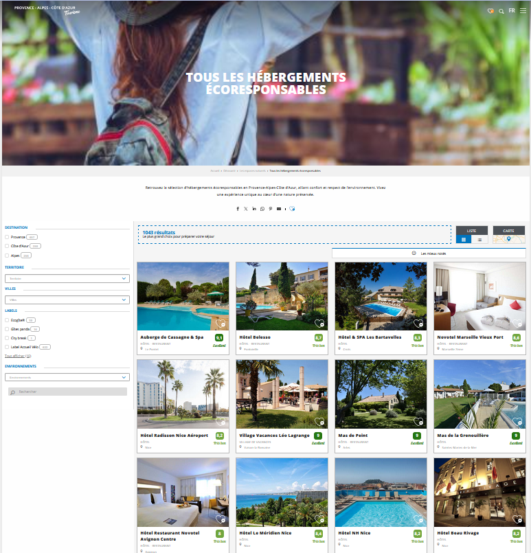 Rédaction de descriptifs ciblés pour valoriser l’implication environnementale des professionnels. Alimentation de la rubrique « Ils s’engagent » à partir du champ thématisé d’Apidae. Voir : Tous les hébergements écoresponsables Comité Régional de Tourisme Région Sud – 2023-2024-2025