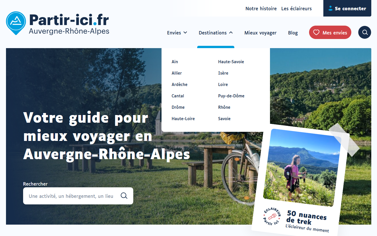 Production de contenus pour le site « partir-ici.fr ». Présentation des atouts des 12 départements, des parcs nationaux et régionaux. Voir Onglet « destinations » Comité Régional de Tourisme Auvergne-Rhône-Alpes – 2024.